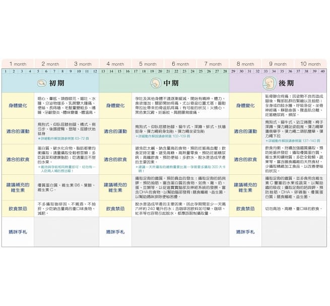詳細且專業地說明每個孕期所經歷的身心變化、建議的飲食方式、需補充的營養素,以及各種貼心的注意事項!