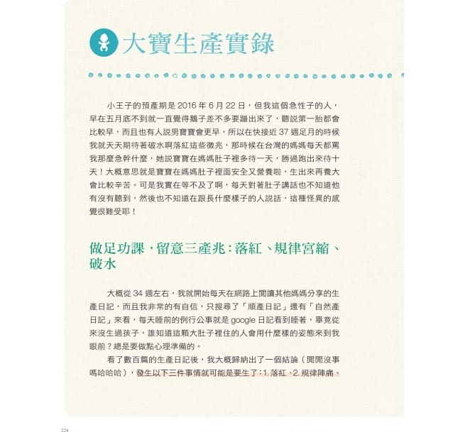 Mi 真的在這本書中寫下了所有孕媽咪在懷孕過程中會有的感受!當閱讀她寫的懷孕及生產過程,讓我也想起我懷第一胎和第二胎時也有一樣的感覺,那個時候我的情緒也很複雜,很難形容,卻在讀了Mi 的日記後,我懂了當時自己有那些感受的原因。